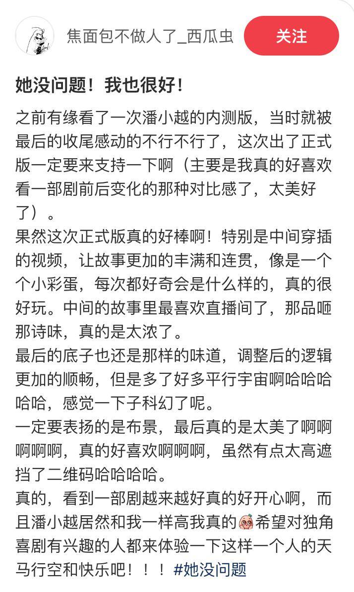 “潘小越简直就是我的嘴替” “她就是在演我啊” “看完真的想对自己说你没问题” “很好笑但同时也很感动” “天马行空的快乐让我和解了”……