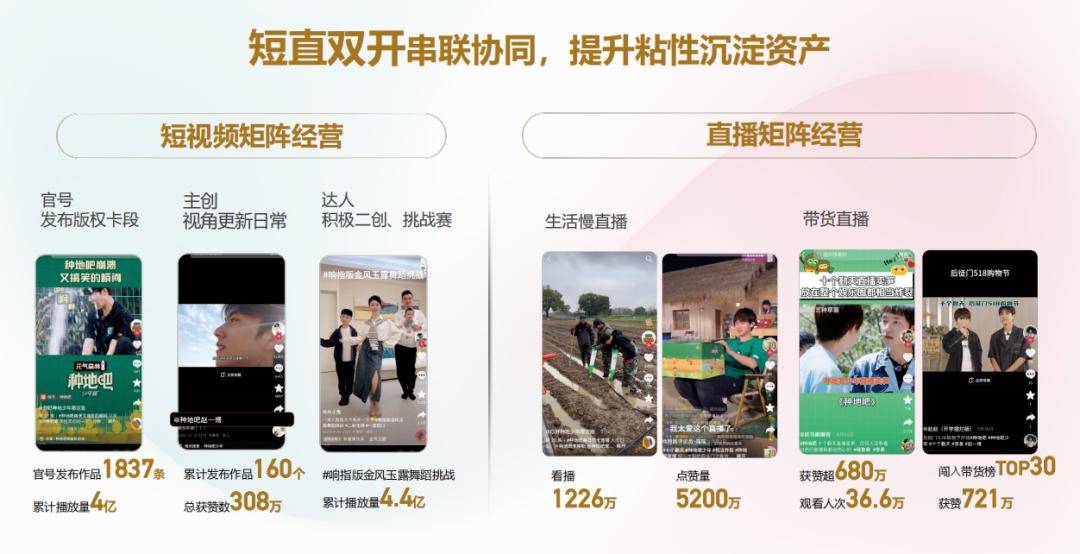 作为短视频平台的抖音,不仅频频试水自制综艺IP的搭建,同时还不断地发挥自身在综艺宣发阵地上的新作用力,创新采取“短视频 直播”的复合模式,借助短视频传播热点,整合“官号 主创 品牌”的多元直播,延伸综艺IP热度周期和拓展新商业可能。诸如以爱奇艺综艺《种地吧》为例,“十个勤天直播卖笋”结合正片节目内容,打通直播电商助农通路,之后更是开启了518购物节带货直播,商品秒空闯入带货榜TOP30。
