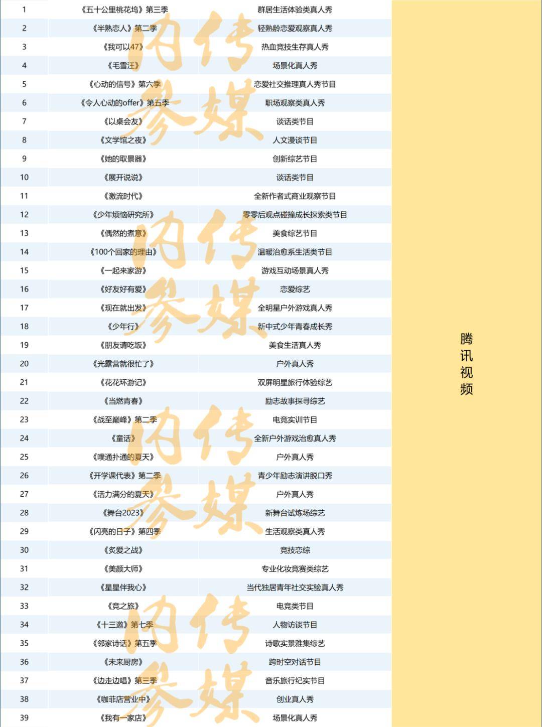 诸如恋爱社交推理真人秀节目《心动的信号6》、职场观察类真人秀《令人心动的offer5》、群居生活体验类真人秀《五十公里桃花坞3》、轻熟龄恋爱观察真人秀《半熟恋人2》、场景化真人秀《毛雪汪》、电竞实训节目《战至巅峰2》、人物访谈节目《十三邀7》等。