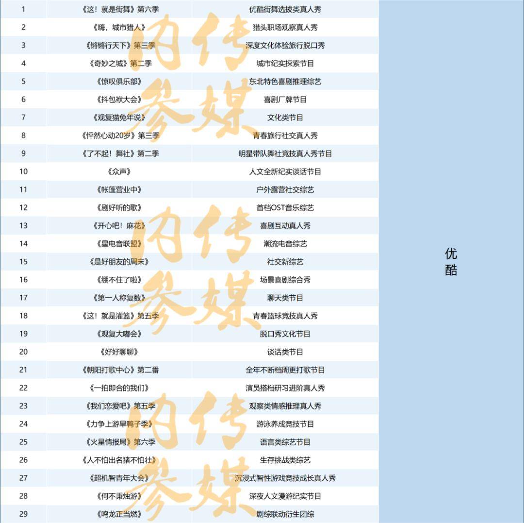 纵观2023优酷综艺的整体表现,其中高口碑综N代,撑起平台综艺的大盘,诸如《这!就是街舞6》《火星情报局6》《这!就是灌篮5》《我们恋爱吧5》《锵锵行天下3》《怦然心动20岁3》等。同时,积极布局人文内容赛道,持续高产推出一批新综,诸如《何不秉烛游》《观复猫兔年说》《观复大嘟会》《第一人称复数》《众声》等。