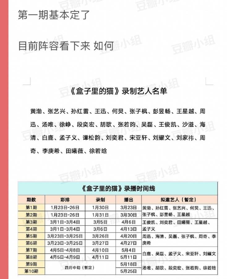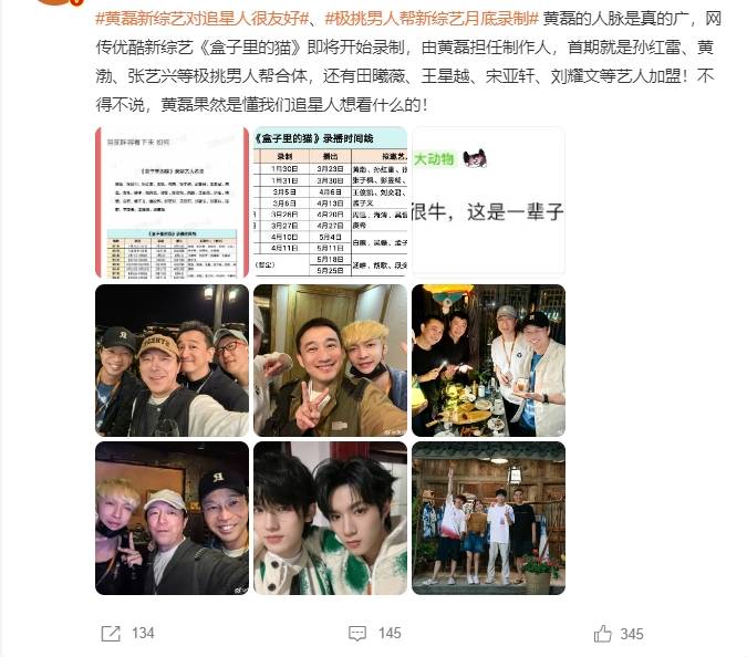 1月11日,一则名为“极挑男人帮新综艺月底开录”的词条被推上热搜,有知情网友不仅爆料了黄磊的全新综艺《盒子里的猫》将于一月底开录,还透露了前5次录制的完整嘉宾名单。原来黄磊的杀手锏不仅仅是男人帮重聚,超级豪华的嘉宾阵容更是让网友直呼排场好大,不愧是黄老师。