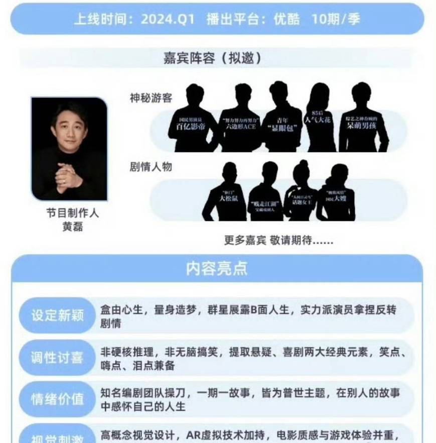 光从名单就可以感受到,这次黄磊既邀请了刘奕君、周迅、胡歌等实力派演员,又邀请了孟子义、田曦薇以及王星越等新生代演员,再加上男人帮和张艺兴、彭昱畅以及何炅的加持,势必要将不同年龄段的观众一网打尽,外加推理的设定,这档全新综艺值得大家期待。