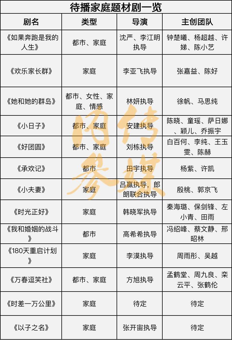 据不完全统计,目前待播的家庭题材剧达13部以上,包括《如果奔跑是我的人生》《欢乐家长群》《她和她的群岛》《小日子》《好团圆》《承欢记》《小夫妻》《时光正好》《我和婚姻的战斗》《180天重启计划》《万春逗笑社》《时差一万公里》《以子之名》。