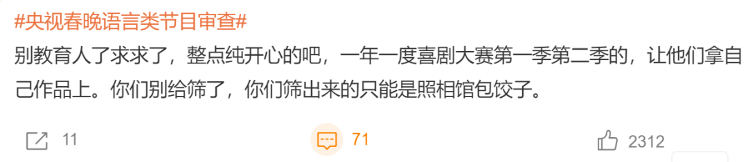 第二,不少网友觉得近年的春晚小品侧重点不再是“搞笑”,更多放在“教育”上,比如备受争议的《风雪饺子情》和《初见照相馆》。而网友觉得,春晚看小品其实最大的心愿就是“开心”,并不喜欢看有教育意义的煽情情节。