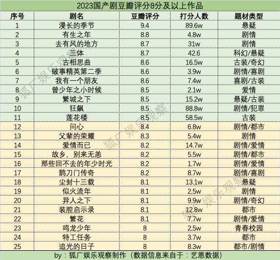 上半年,《漫长的季节》斩获豆瓣9.4分,成为2023年国产剧集口碑之最;《三体》《去有风的地方》等作品紧随其后,豆瓣评分收获8.7分。
