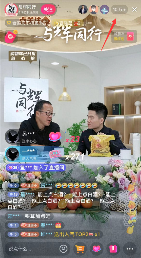 让人惊讶的是“与辉同行”做为新账号,首次直播,没有想到刚开播,在线人数即达到10万 ,可以想象在未来这个账号的数据,将会达到一个让人恐怖的数字。