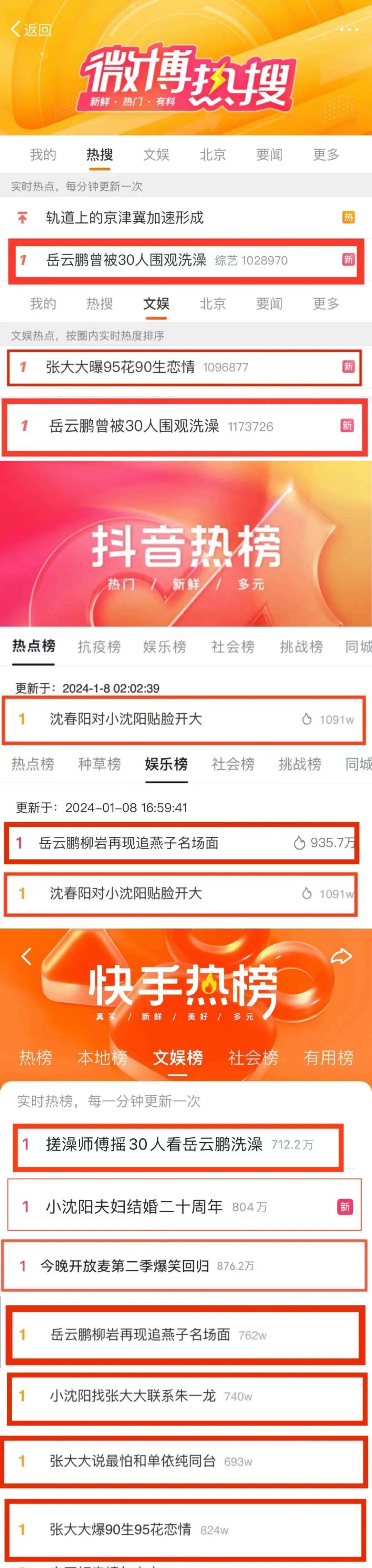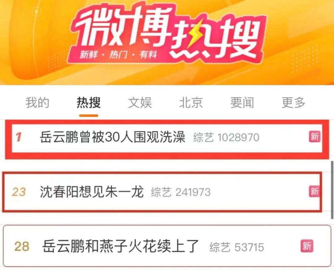 主榜从top1#岳云鹏被30人围观洗澡#到top19#沈春阳想见朱一龙#再到top28#岳云鹏和燕子火花续上了#,话题讨论度居高不下,一口气上了30个微博热搜,不知道的还以为《今晚开放麦》第二季在热搜买房了。