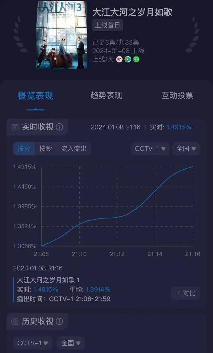 近日,万众瞩目的《大江大河之岁月如歌》(以下简称《大江大河3》)终于在开播了,在晚上九点仅在央一上线一集的情况下,收视率突破了1.5,上线第一天就取得了好成绩。