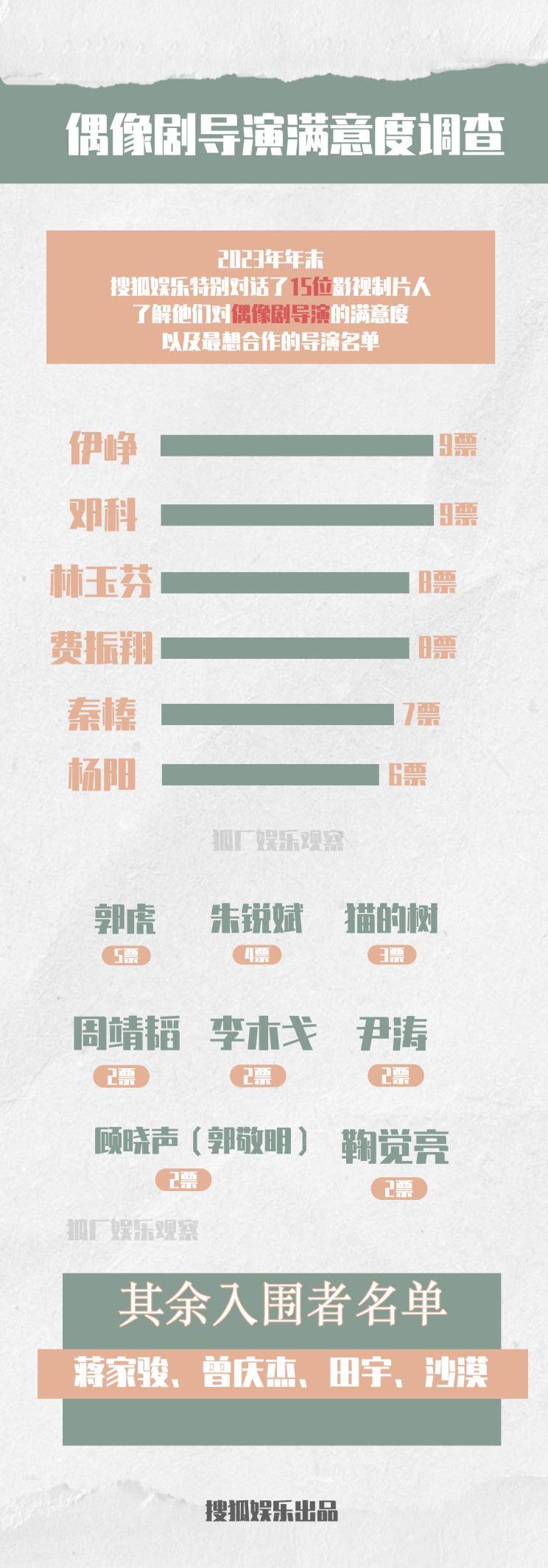 为调查业内人士对偶像剧导演的满意度,在2023年年末,搜狐娱乐特别对话了15位影视制片人,了解他们对偶像剧导演的看法,以及最想合作的导演名单。