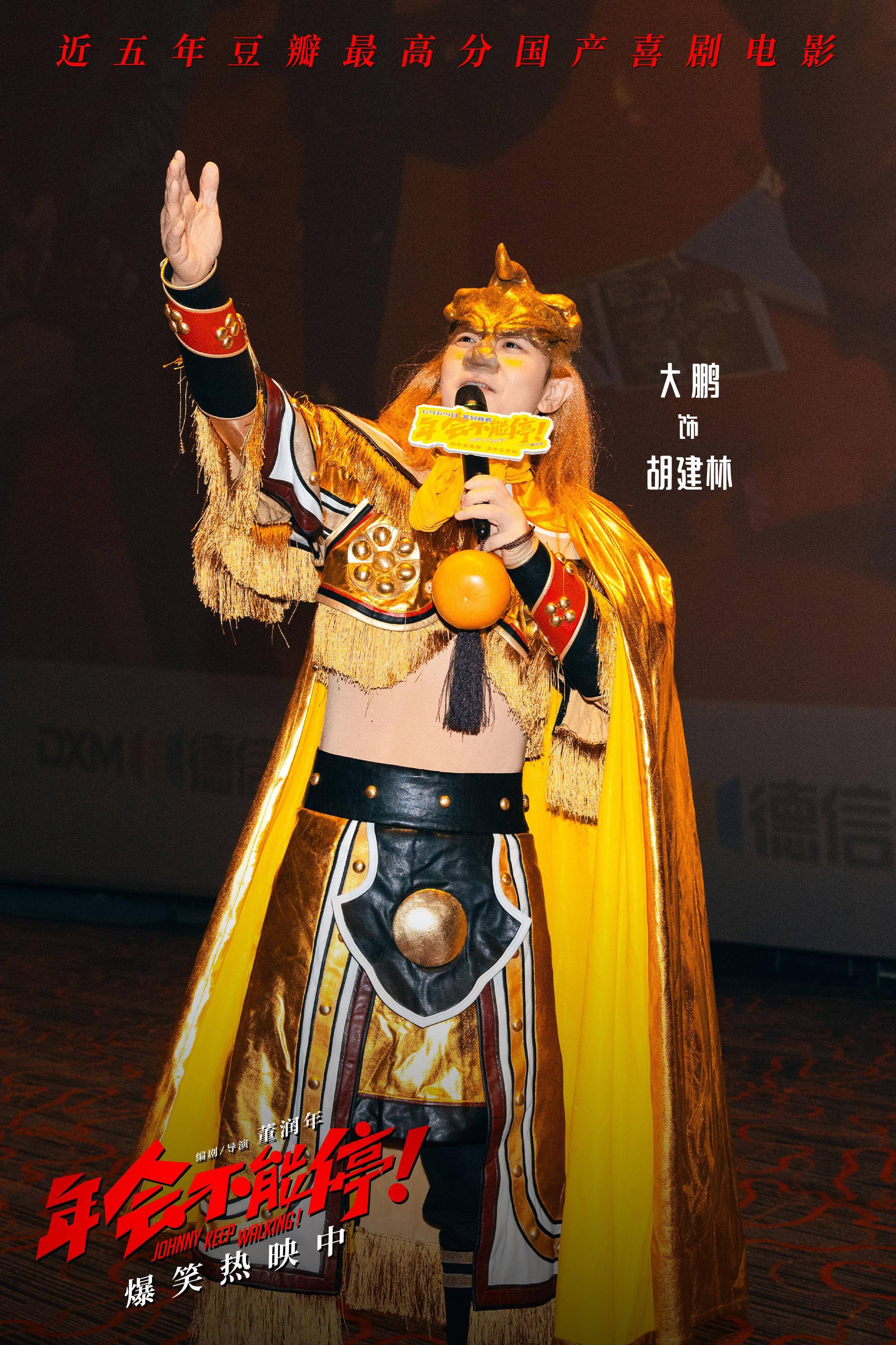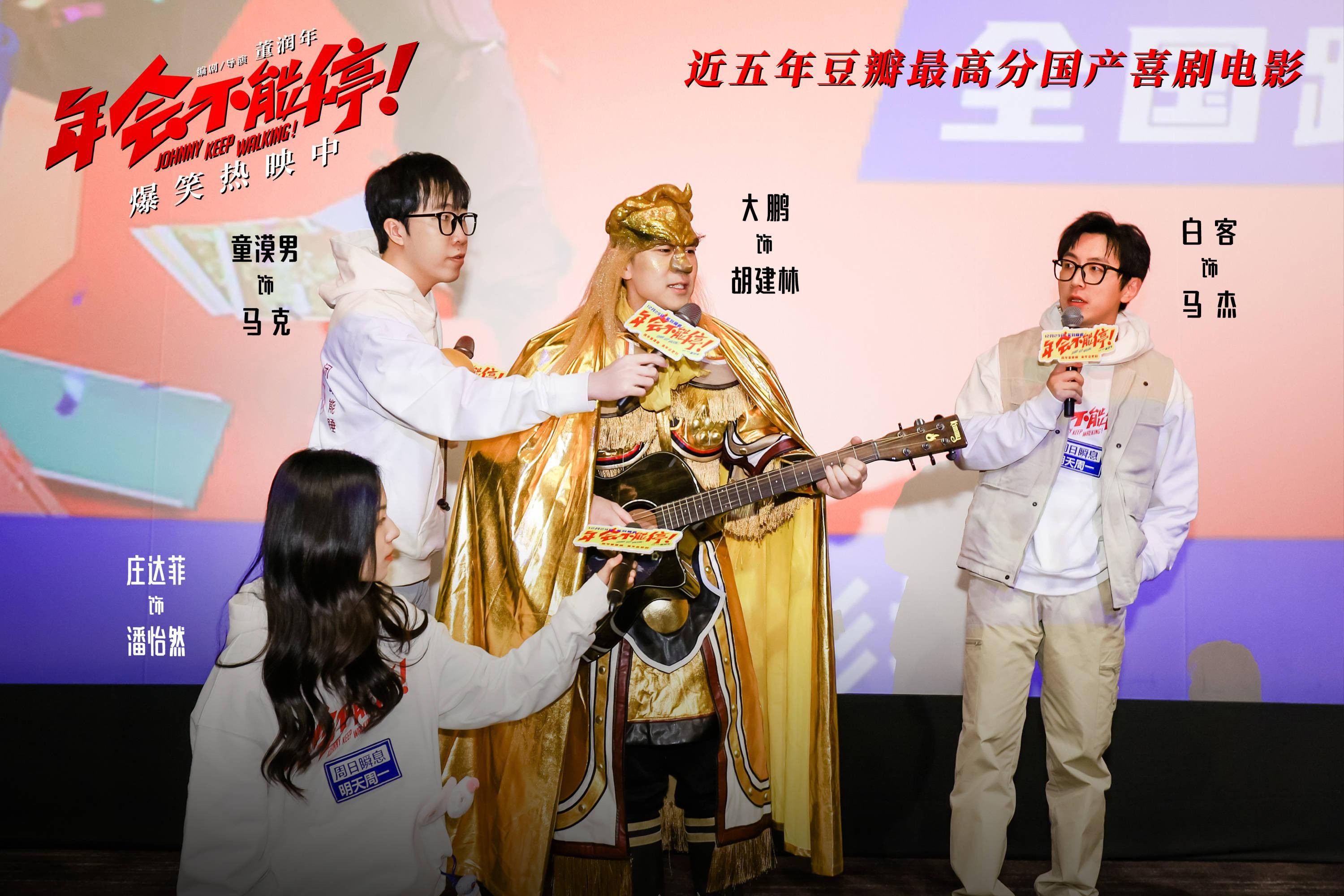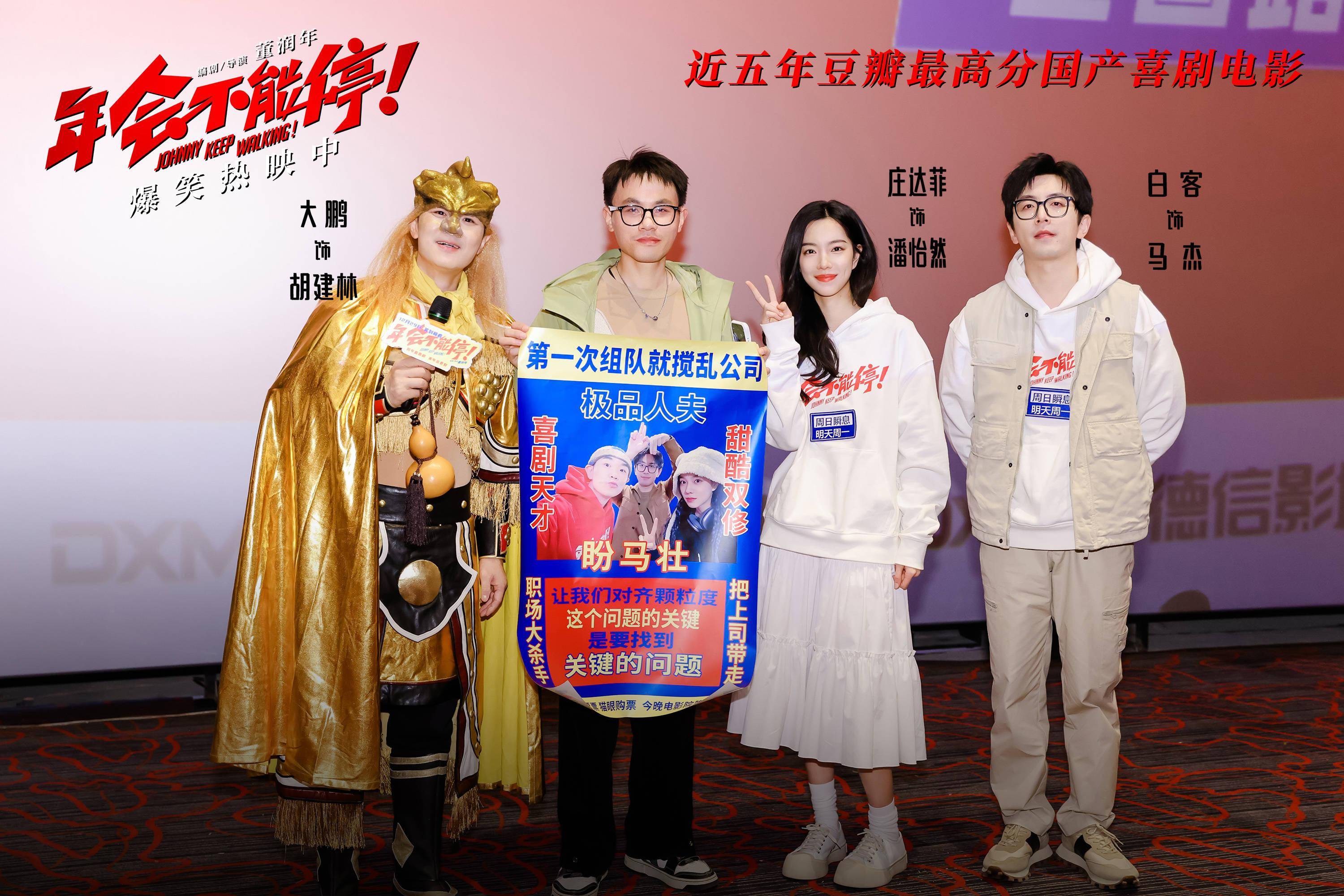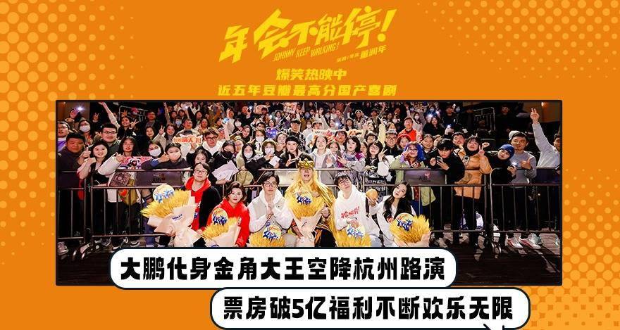 1月7日,爆笑喜剧 电影《年会不能停!》 杭州路演活动现场, 编剧兼导演董润年、编剧兼制片 人 应萝佳,演员大鹏、 白客、 庄达菲、 童漠男与观众展开交流互动。当天,电影票房突破5亿,大鹏兑现福利,以“ 特制皮肤 ”金角大王的造型亮相,并现场玩起点名梗,引爆全场热闹气氛。而《学猫叫》花絮片段也作为票房5亿福利在当天上线,年会表演不仅有“盼马壮”组合的爽燃Rap,还有肉食动物等人带来的魔性舞蹈,夸张上头的猫耳造型和“销魂”舞姿,尽显令人捧腹的喜剧“笑”果。口碑黑马巅疯喜剧,豆瓣评分8.2,正在爆笑热映中。