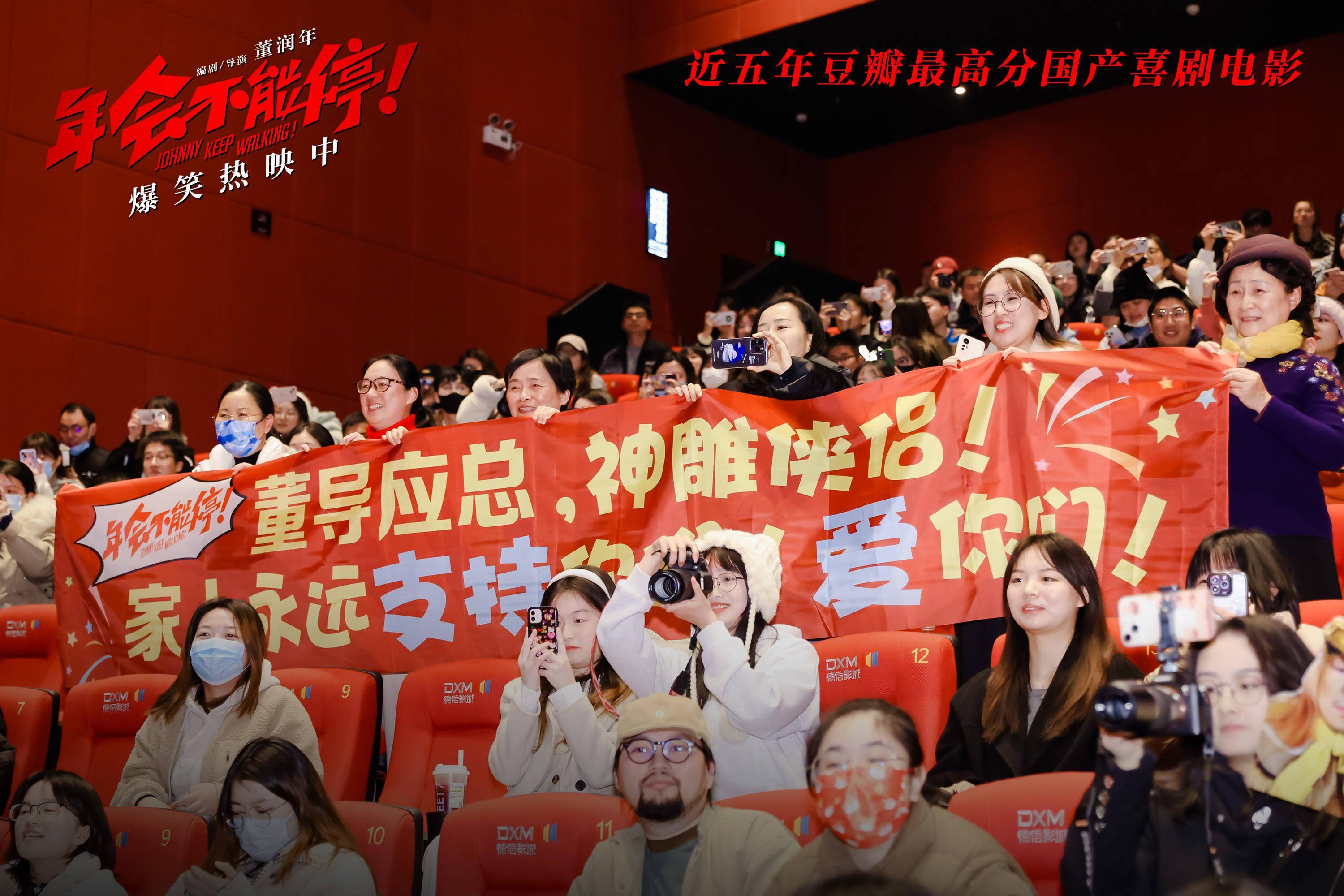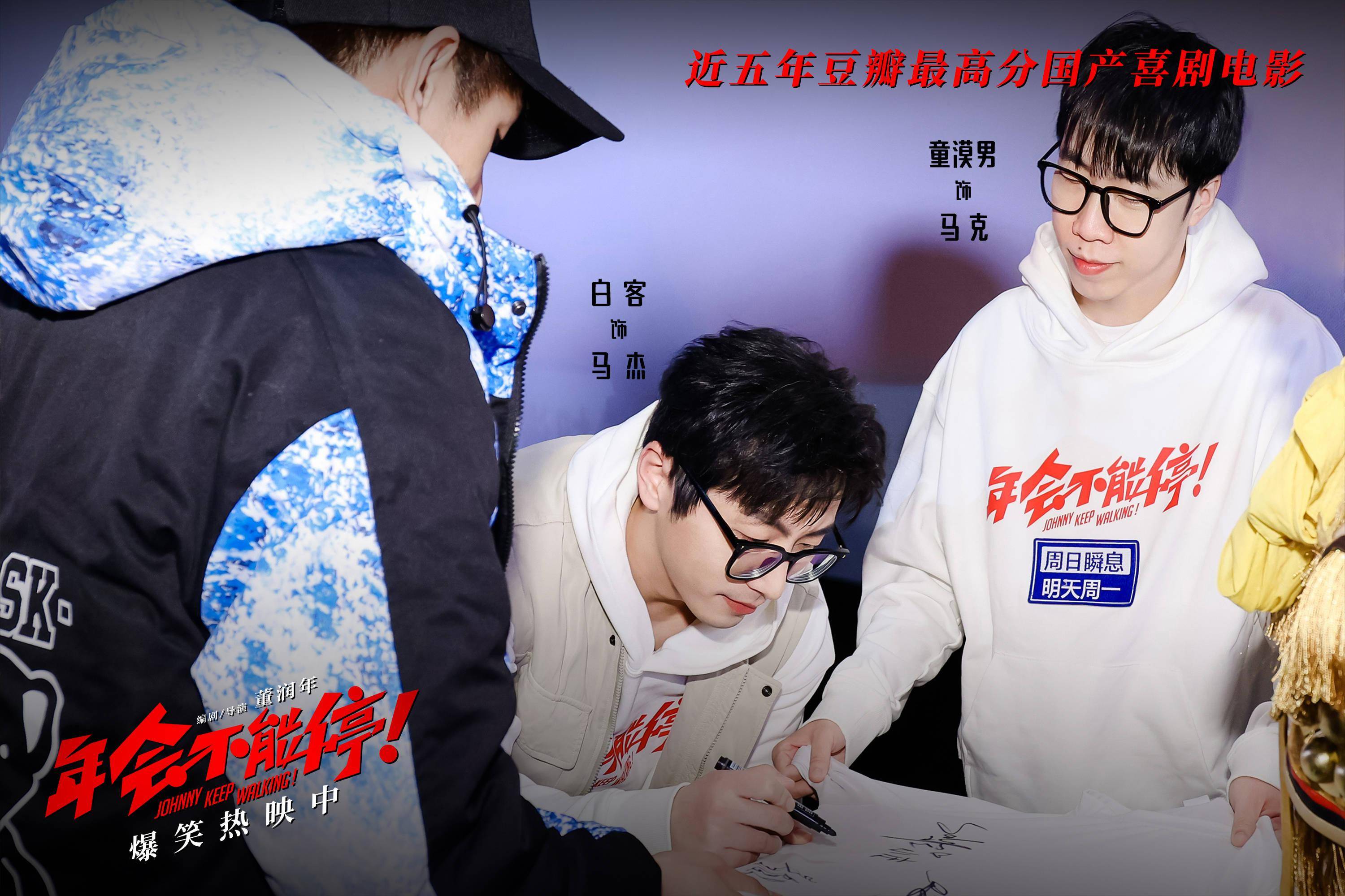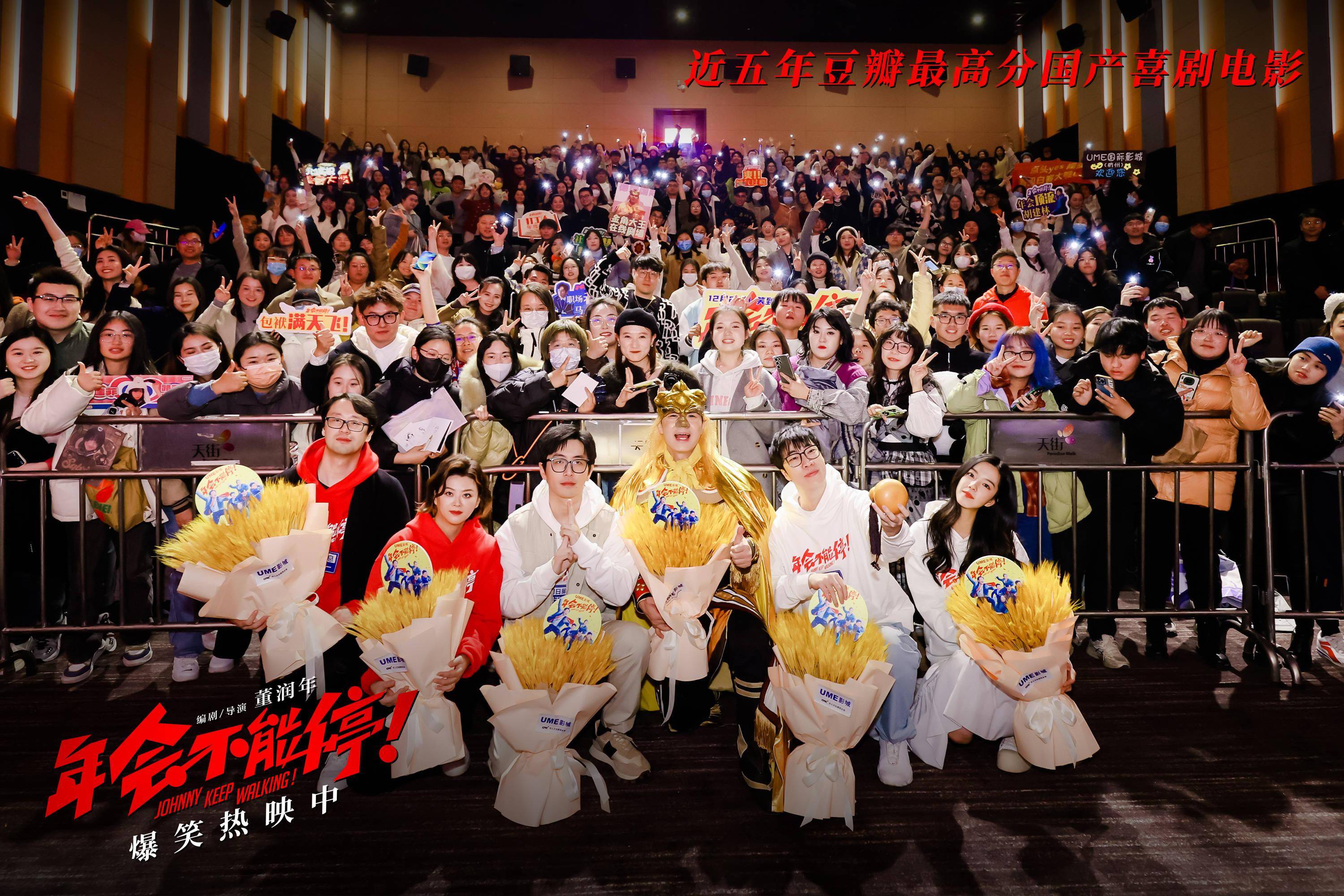 1月7日,爆笑喜剧 电影《年会不能停!》 杭州路演活动现场, 编剧兼导演董润年、编剧兼制片 人 应萝佳,演员大鹏、 白客、 庄达菲、 童漠男与观众展开交流互动。当天,电影票房突破5亿,大鹏兑现福利,以“ 特制皮肤 ”金角大王的造型亮相,并现场玩起点名梗,引爆全场热闹气氛。而《学猫叫》花絮片段也作为票房5亿福利在当天上线,年会表演不仅有“盼马壮”组合的爽燃Rap,还有肉食动物等人带来的魔性舞蹈,夸张上头的猫耳造型和“销魂”舞姿,尽显令人捧腹的喜剧“笑”果。口碑黑马巅疯喜剧,豆瓣评分8.2,正在爆笑热映中。