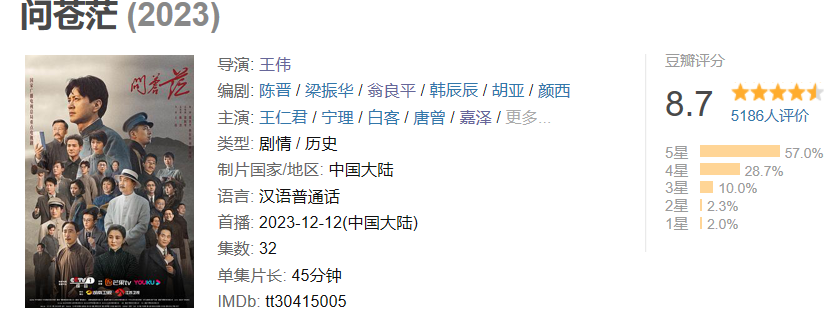 但这部剧评分达到8.7分,就是央视一套的《问苍茫》。