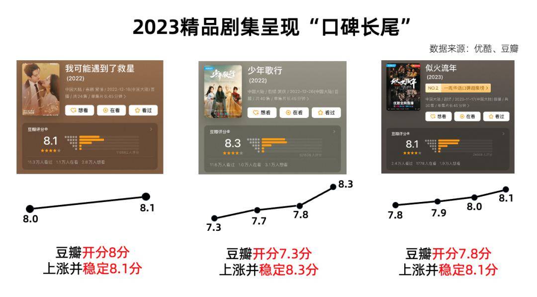 2023年优酷诞生了《鸣龙少年》《新闻女王》《异人之下》《似火流年》《少年歌行》《追光的日子》等多部豆瓣超8分剧,并呈现“口碑长尾”效应:《我可能遇到了救星》豆瓣开分8.0,上涨后稳定保持在8.1分;《少年歌行》开分7.3,上涨并稳定在8.3分;《似火流年》开分7.8,后上涨稳定在8.1分。