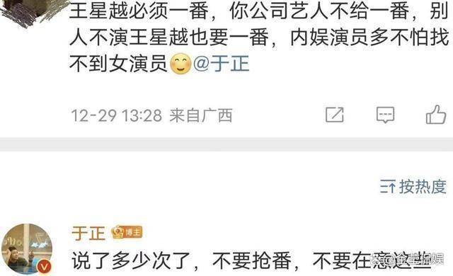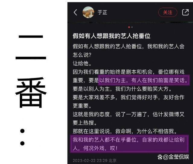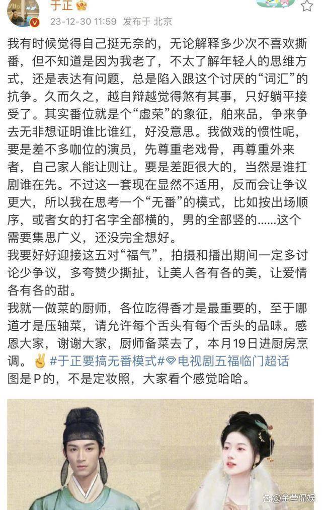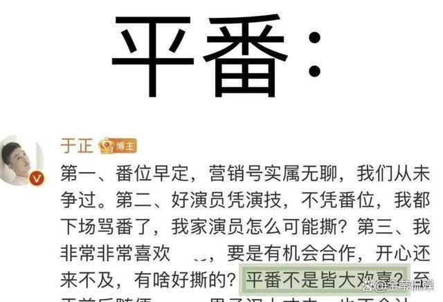于正一直强调自己公司的演员不在乎番位,他本人对于这种争番行为也感到很无奈,其实番位就是个“虚荣”的象征,舶来品,争来争去无非想证明谁比谁红,好没意思,于正说他做戏的惯性呢,要是差不多咖位的演员,先尊重老戏骨,再尊重外来者,自己家人能让则让,要是差距很大的,当然是谁扛剧谁在先。