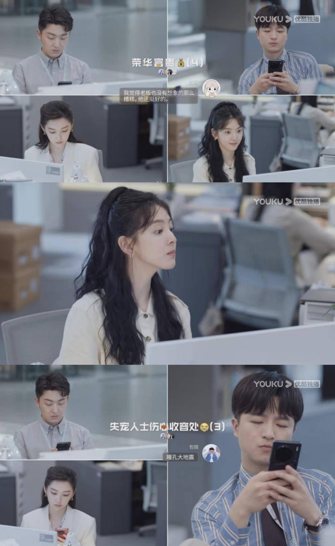 《你也有今天》里的办公室“荣华富贵”三人组,也个个都是喜剧人。他们能干出四个人建三个群的操作,也能对“病娇”老板偶尔星星眼,可以苦中作乐自诩为公司“储君”,也会为了减缓压力自我攻略为老板的“粉丝”。他们最有当打工人“嘴替”的潜质,为作品的喜感加分不少。