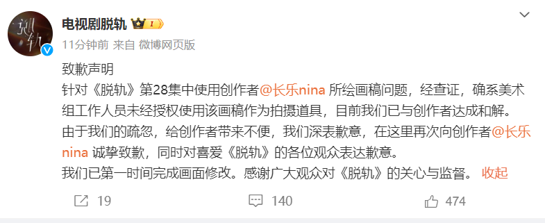 针对《脱轨》第28集中使用创作者@长乐nina 所绘画稿问题,经查证,确系美术组工作人员未经授权使用该画稿作为拍摄道具,目前我们已与创作者达成和解。由于我们的疏忽,给创作者带来不便,我们深表歉意,在这里再次向创作者@长乐nina 诚挚致歉,同时对喜爱《脱轨》的各位观众表达歉意。