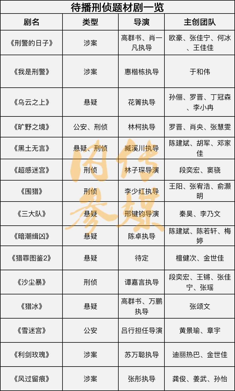据不完全统计,目前待播的刑侦题材剧达16部以上,包括《刑警的日子》《我是刑警》《乌云之上》《正当防卫》《旷野之境》《黑土无言》《超感迷宫》《围猎》《三大队》《暗潮缉凶》《猎罪图鉴2》《沙尘暴》《猎冰》《雪迷宫》《利剑玫瑰》《风过留痕》。