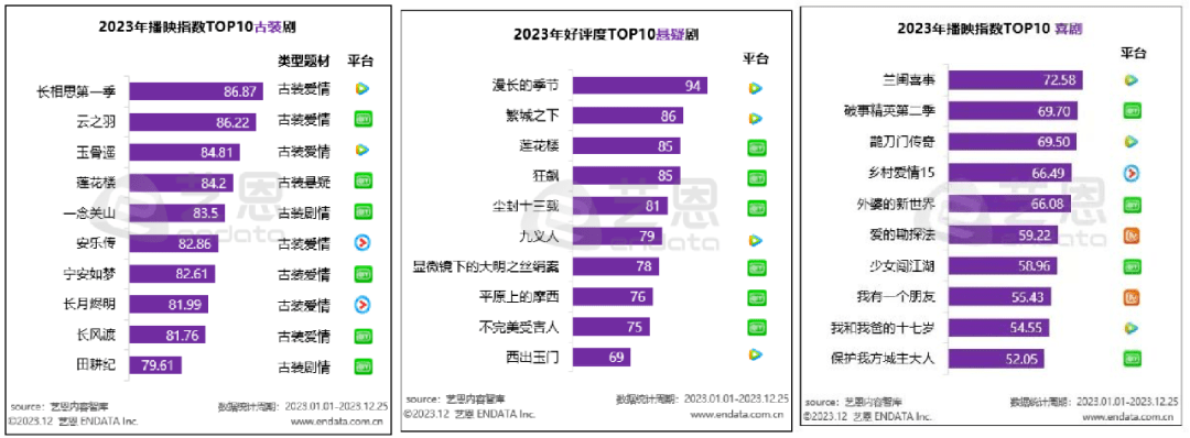 根据艺恩推出的2023年剧集市场年度复盘数据,在各大类型剧集2023年播映指数TOP10中,榜单NO.1的头部剧皆来自腾讯视频。值得一提的是,古装、悬疑、喜剧三大类型赛道的前三名中,腾讯视频剧集皆占据两席。