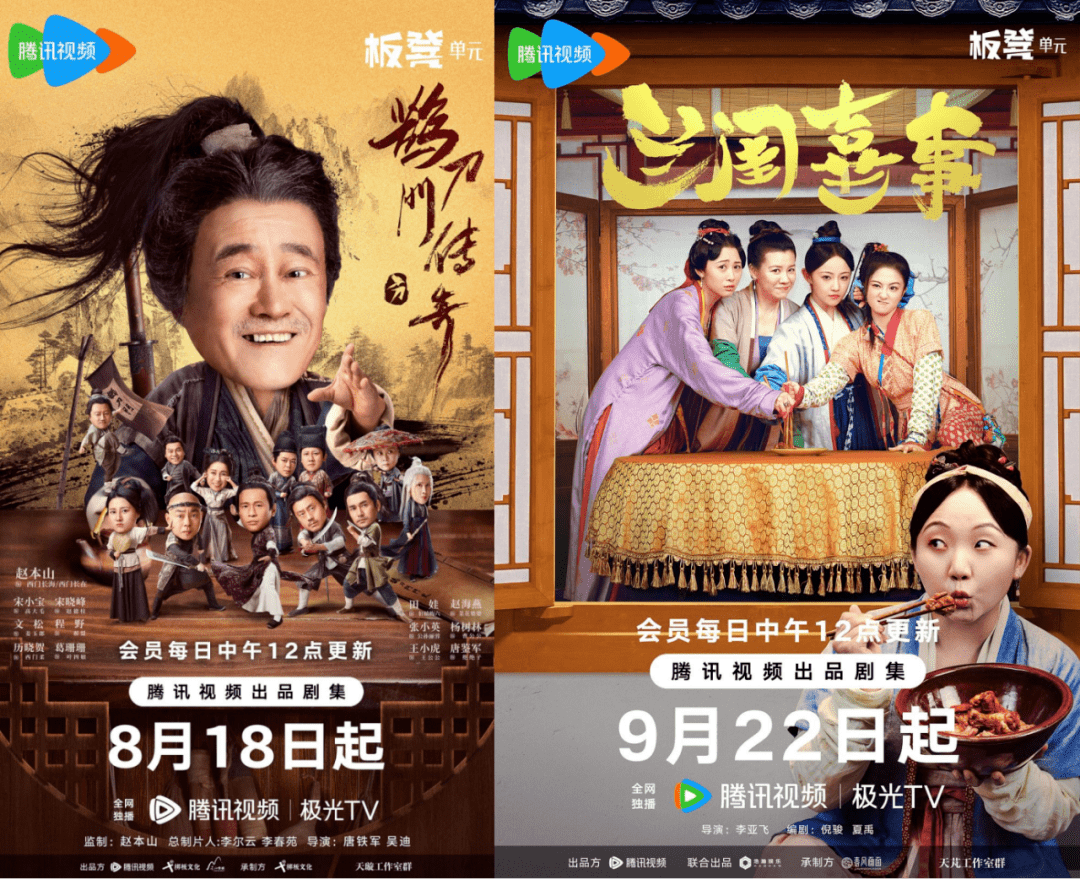 目前板凳单元已播出的剧集有赵本山领衔的东北武侠喜剧《鹊刀门传奇》和以刘琳领衔的古装合家欢家庭喜剧《兰闺喜事》,前者在嬉笑怒骂中针砭时弊,后者以亲情视角借古喻今,两部剧以不同的喜剧风格成为2023年不少观众的“电子榨菜”。