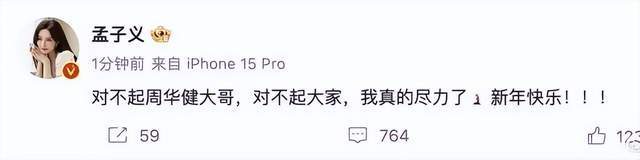 #孟子义跑调很突出#词条,直接引爆全网后,孟子义立即发微博道歉:对不起周华健大哥,对不起大家,我真的尽力了,新年快乐!