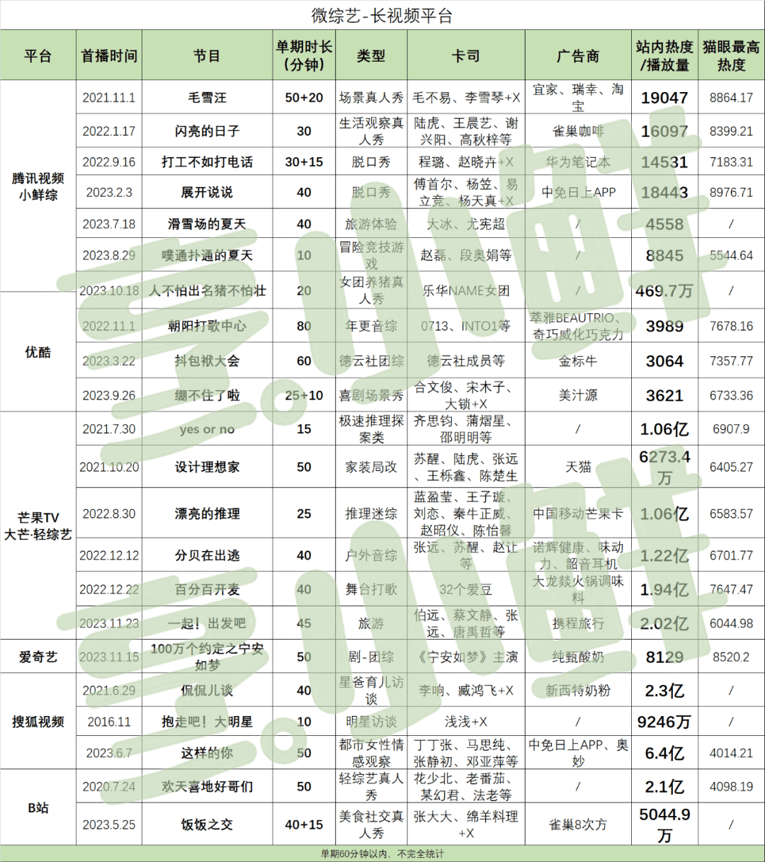 烹小鲜(pengxx01)总结了各大平台近年来代表性微综艺节目(单期60分钟以内)及成绩,试图一探“微综艺”这一市场新类型内容的成功率。本期为「微综艺01-长视频平台篇」。