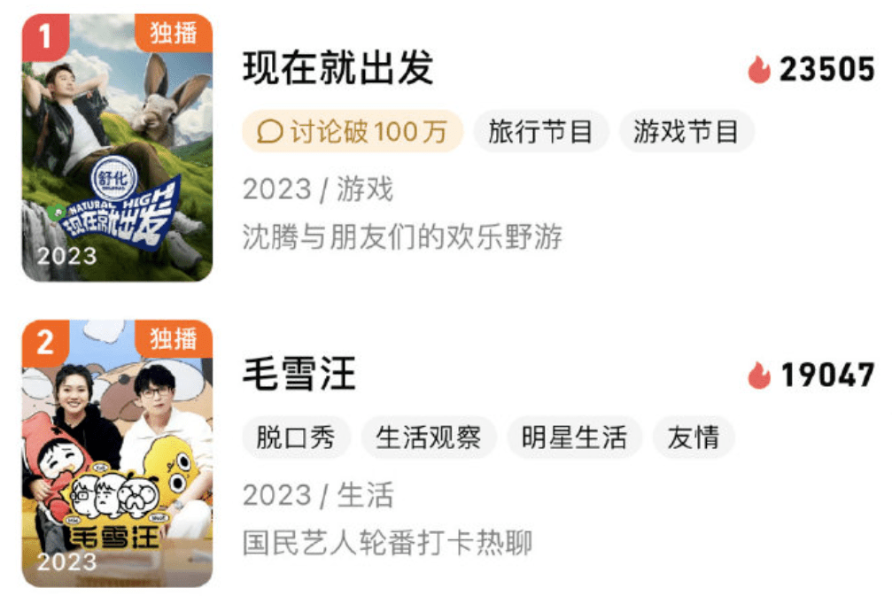 但严格来讲,以上作品皆不算成功,最高播放量仅为《一起!出发吧》2亿出头,比不上爆款节目单期数据,基本都称不上出圈。