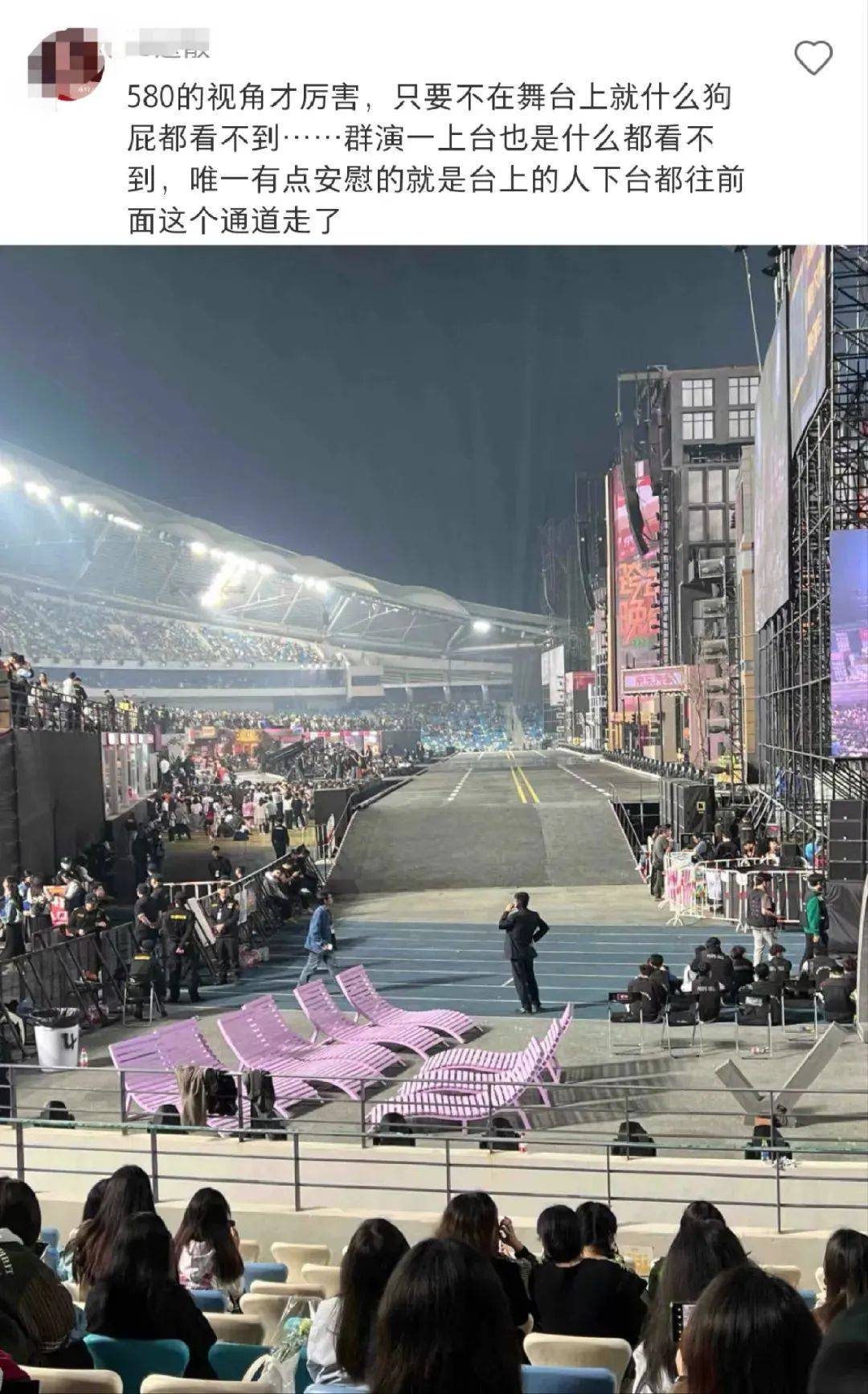 很多网友都开始嘲讽,比如说过舞台侧边售价580的位置,如果明星们在表演的不站在外面的舞台上,这里的观众就啥也看不见,能看到的,只有明星下场的那几秒钟。