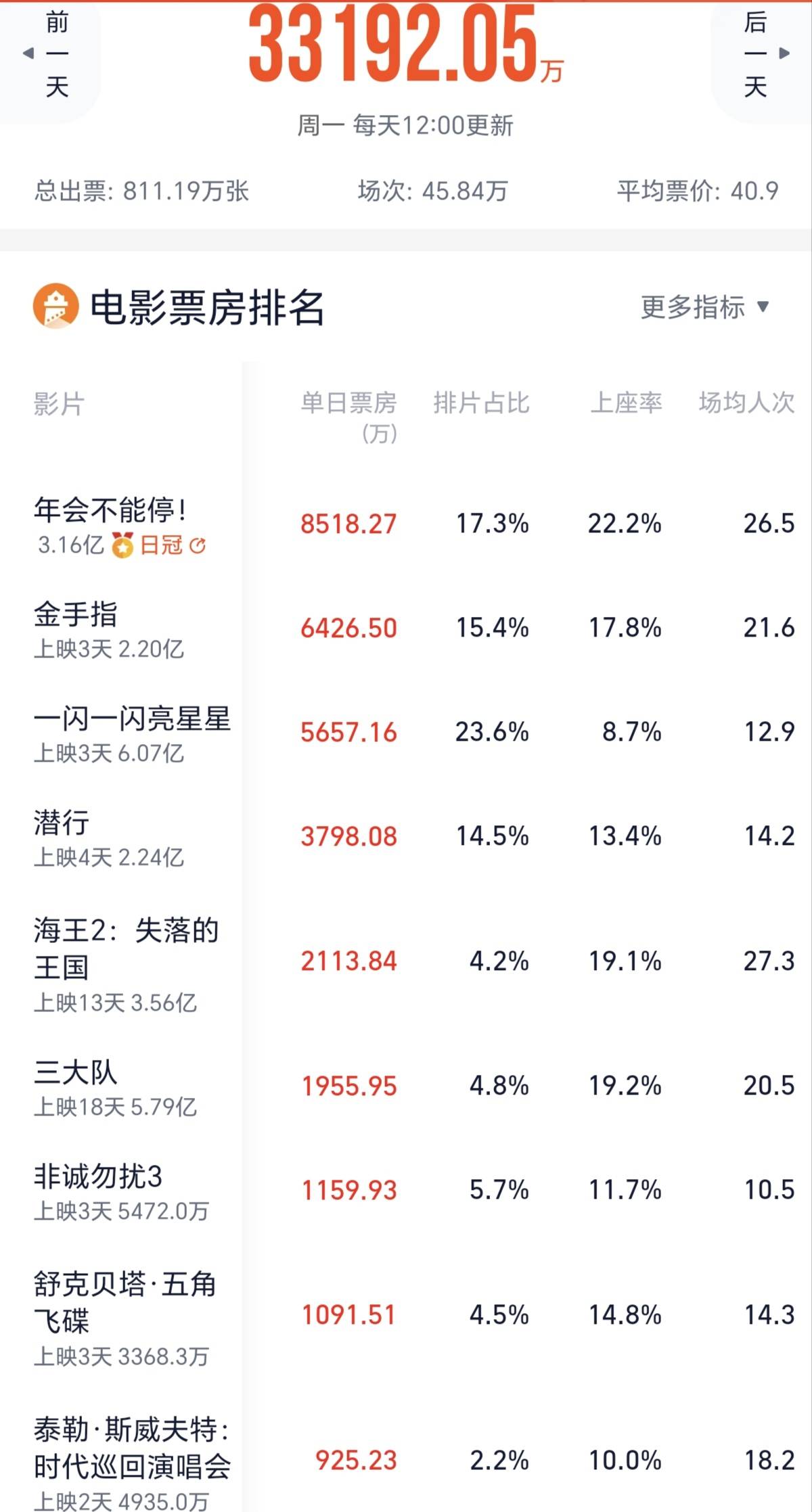 刘德华主演的港片《金手指》和《潜行》排片基本相当,《金手指》表现更好,上座率、日期票房逐日在拉开和《潜行》的距离,成为排在《年会不能停!》之后的日票房第二。