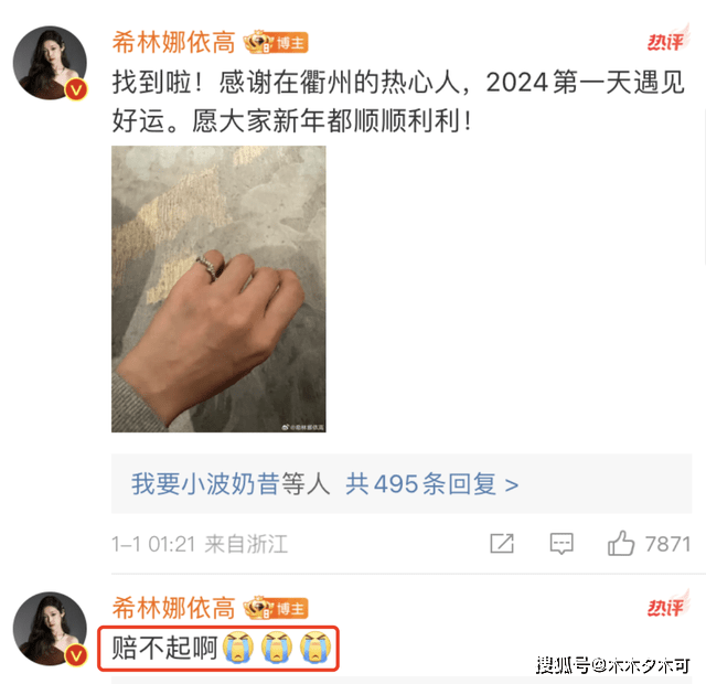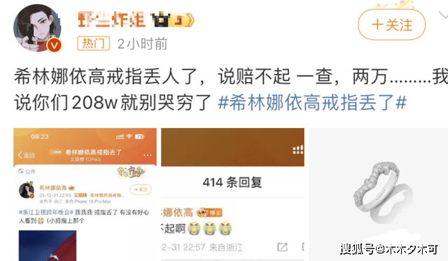 浙江卫视这边,艺人们也同样的状况百出,比如希林娜依高,表演完后发现自己戒指丢了,在微博搞寻物启事,网友一扒,她戴的这枚戒指价值20000,而希林娜依高还在评论区说自己赔不起,被质疑是在哭穷。