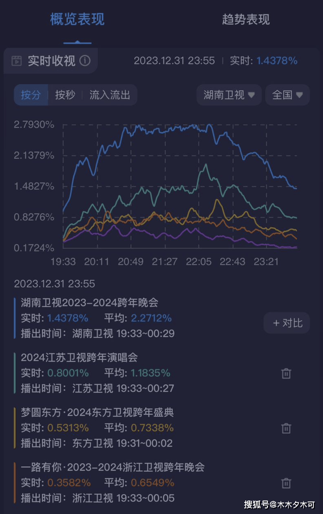 今年四大卫视跨年晚会收视出来了,湖南卫视跨年以平均2.17 拿下全国收视第一,江苏卫视跨年以平均1.16 拿下全国收视第二,东方卫视第三0.68,浙江卫视第四0.63,这个结果可以说毫无悬念,似乎年年都如此,湖南卫视称首,浙江卫视垫底。
