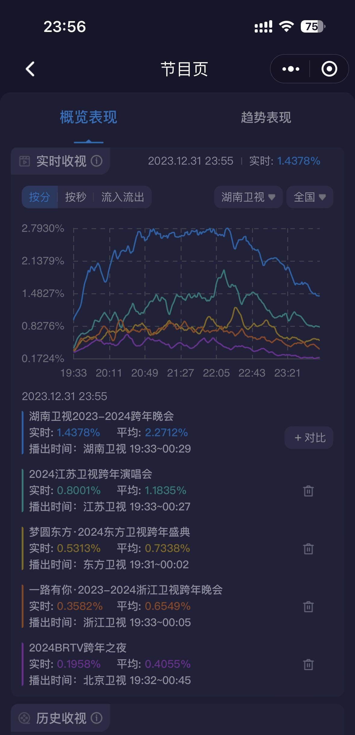 湖南卫视跨年晚会收视率成绩斐然,其中收视率峰值最高分别为黄晓明、魏大勋和陈楚生。