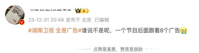 尽管湖南卫视跨年晚会很精彩,但其中也难免有些让观众意犹未尽的瑕疵。观众纷纷指出,虽然精彩的舞台表演让人流连忘返,但紧随其后的广告潮流却让整个观影体验大打折扣,让人不禁感慨:“一个节目后面跟着8个广告”。