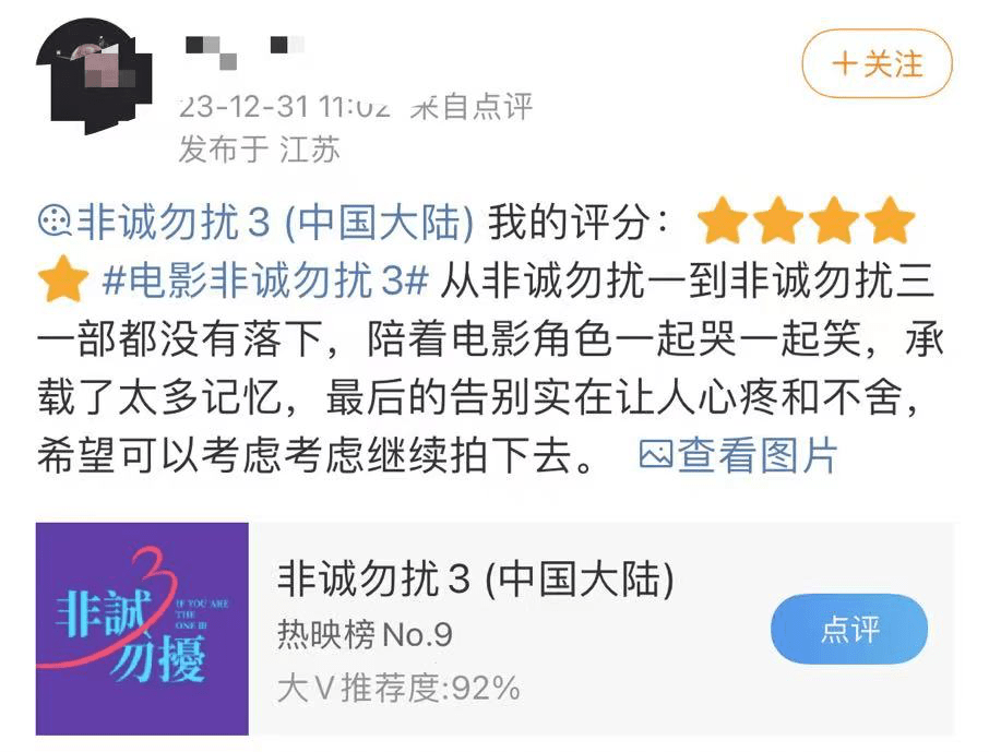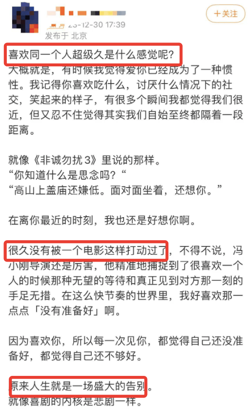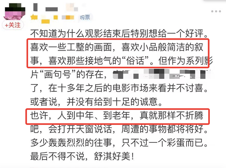 告别,从爱人、朋友、到我们本身。15年里,我们经历了多少人,多少事,和谁相遇,有和谁走散了,坐在影院,看到秦奋和朋友在一起的场景,会忍不住问问自己,一起陪你看第一部第二部《非诚勿扰》的人,还在身边吗?