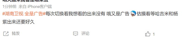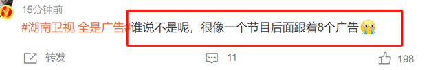 没想到晚会开始之后湖南卫视中间插入的广告也不少,没等看几个节目呢,一会儿一个中插广告,观众看得都烦了,吐槽这广告都比节目多。
