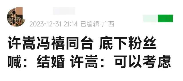 最后再聊一下许,某站的跨年晚会邀请到了他,恰好主持人是冯禧,两人之前的恋情也是传得沸沸扬扬。这次同台,有大胆的粉丝直接大喊结婚,没想到许嵩大方回应“可以考虑”。看来2024年内娱说不定又有喜讯传出了呢!
