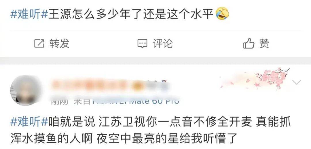 对于王源的唱功,有人直言破音,难听,也有人觉得像是话筒没声,还有人怪江苏卫视不给修音。