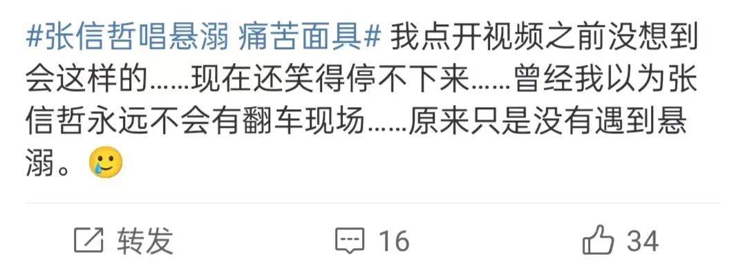 张信哲演唱的《悬溺》,与原版区别太大,原版明明是一首比较甜的歌,尤其是高潮部分,特别有感觉,但是张信哲唱出来,有种老年迪斯科的既视感,被说像戴了痛苦面具,太违和了,被指“翻车”。