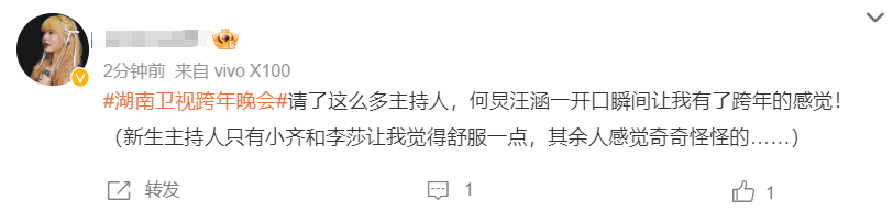 湖南台之前还试图通过跨年晚会推出新生代主持人,可惜至今没能选出能够接班挑大梁的新人,从网友的态度看,哪怕新人主持们没少在湖南台露面,但认知度和好感度远不及前辈,特别是在跨年晚会如此重要的场合,有人觉得,新人主持的出现很是破坏气氛。