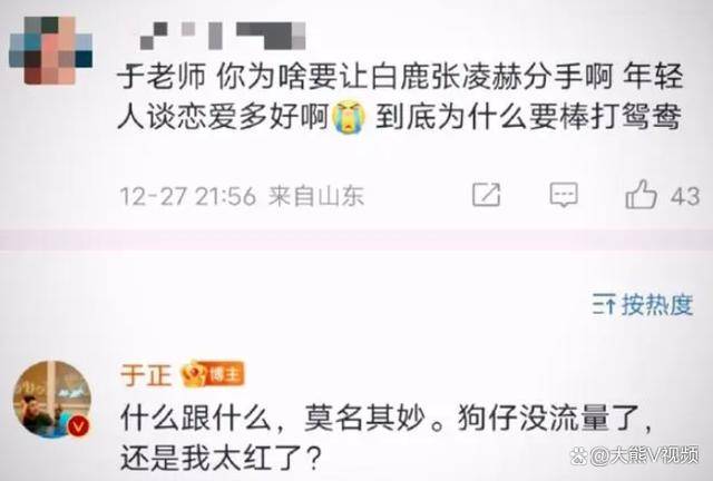 原标题:白鹿、张凌赫被传分手,于正发声辟谣:“与己无关”