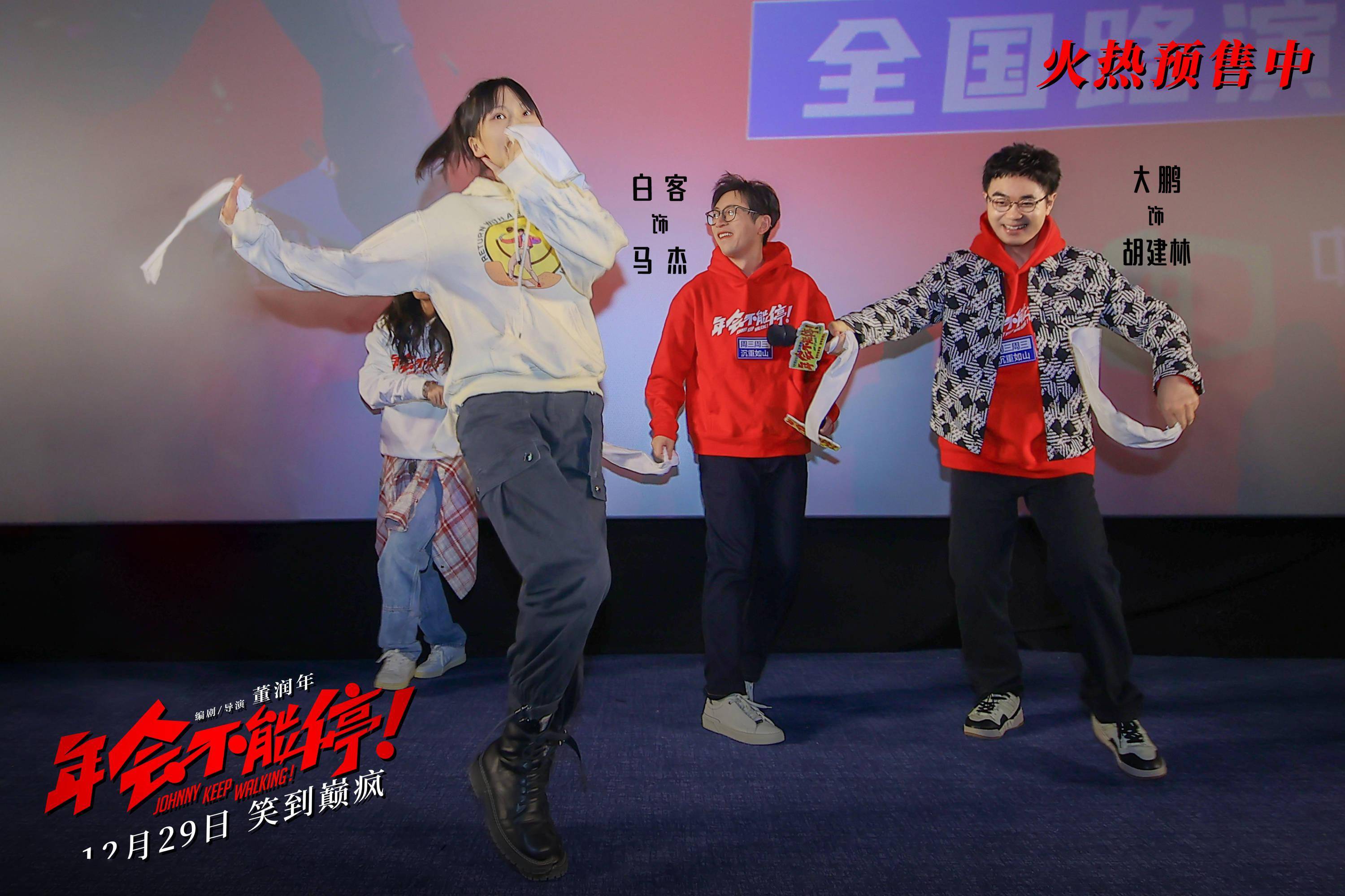 主创们也在长春路演现场回顾了那场戏的拍摄经历。大鹏坦言拍 那场戏 特别难忘,当时三个人都生病发烧了,但拍摄计划早就定好了, 那天来了非常多的群众演员, 所以 必须全力以赴,每次演完一遍就到台下吸氧,吸氧以后再到台上 R ap 。 白客 透露,张雨生的 这首歌 特别高 , 只能 降调 来唱 , 但 因为身体不舒服 , 现场 还 破了一回 音 。 庄达菲则表示, 刚开始导演说年会节目 是让 三 人唱 R ap的时候 , 以为是开玩笑,但群众演员 们 把 气氛烘托得非常到位,所以三个 人都唱得很 过瘾。 随后,他们跟王皓一起演唱了 《 我的未来不是梦 》, 祝福大家笑着跨年,带着好心情迎向未来。 年度高口碑黑马喜剧电影《年会不能停!》, 让你笑到巅疯。