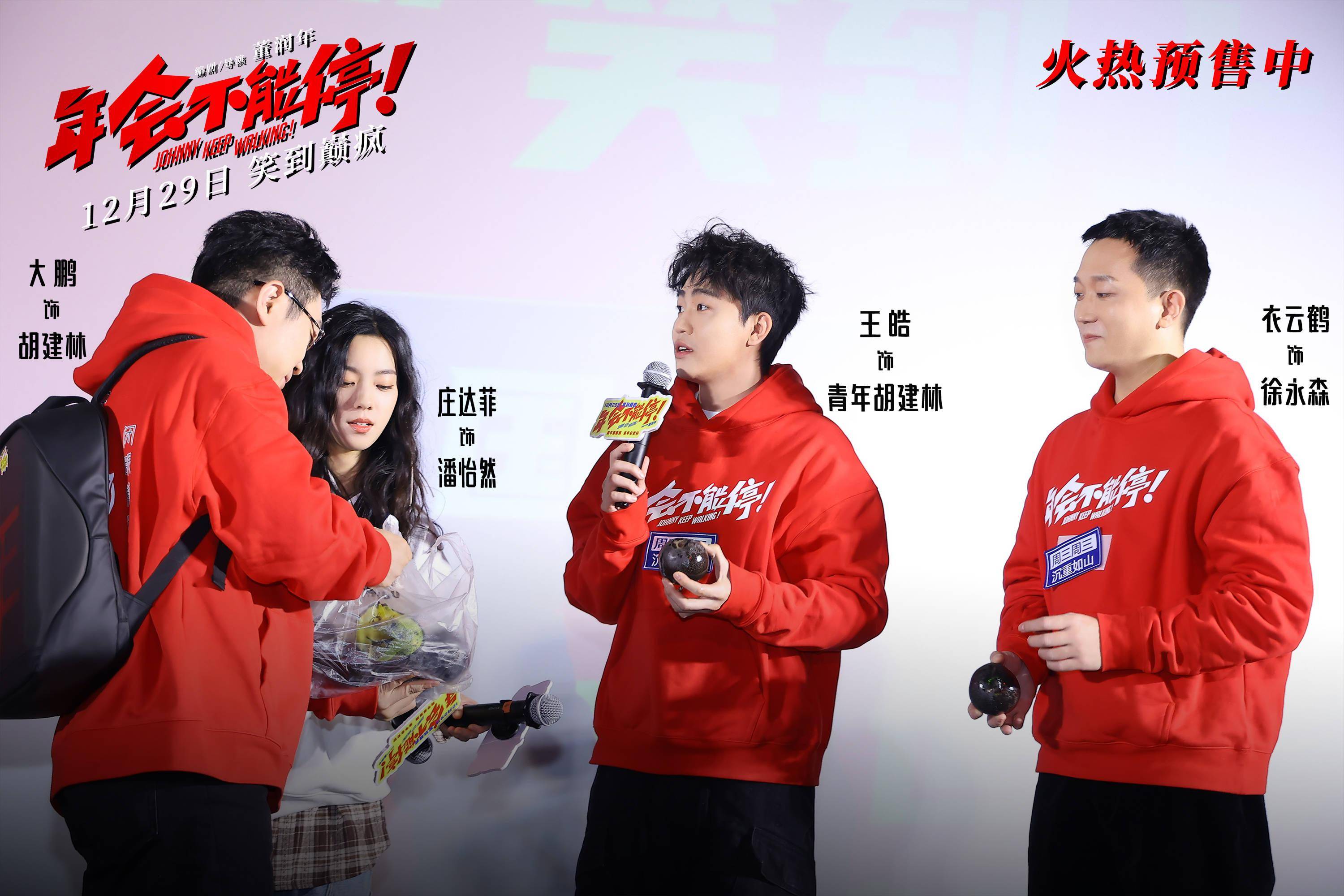 面对观众提出的职场问题,编剧兼导演董润年、编剧兼制片人应萝佳巧妙支招,教观众如何反 PUA领导,“ 天天缠着领导问问题,我不下班也不让他走 ”。电影里胡建林化身金角大王点名的桥段笑翻全场,大鹏也在现场拿着葫芦为大家 吸走加班、吸走不开心、吸走负能量,吸走所有的焦虑 , 送上 新年大吉大利 的祝福。不少观众表示, 大鹏 和 白客是 自己 青春里的喜剧主角, 这次 合作 重新 触发 了大家 的喜剧 DNA 。 白客笑称: “ 我觉得我们俩潜意识 里 都期待这一天的到来, 合作得 挺过瘾的。 ”还有年轻女性观众 很期待 在 工作中遇到和 潘妮 一样的同事,和她一起不畏惧那些限制和约束,自由热爱地活着 。 庄达菲也鼓励 年轻人可以真的去追求自己内心想追求的东西,永远保持那份热爱,眼睛里永远有光 。 谈及此次应大鹏之邀出演年轻胡建林,王皓坦言 “ 很多人都在说我和大鹏老师长得有几分相似,我也 一直 期待合作,《年会 不能停! 》满足了我这个愿望 ” 。 衣云鹤饰演的被 “优化”的程序员徐永森也给观众留下深刻印象,他跟大鹏用东北话重现“优化”戏名场面,狂戳现场观众笑点,将这份欢乐从电影里延续到电影外 。