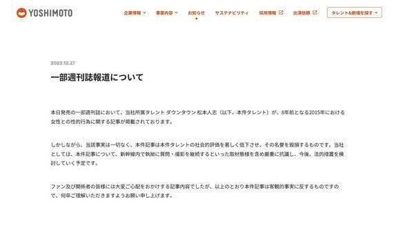 在舆论的巨大压力下,吉本兴业于27日发布声明,全盘否认了有关报道的指控。声明中表示:“没有任何事实根据支持这些指控,这不仅损害了涉及艺人的名誉,也导致社会对他们的评价下降。我们将认真研讨采取法律相关措施,捍卫艺人的权益。”