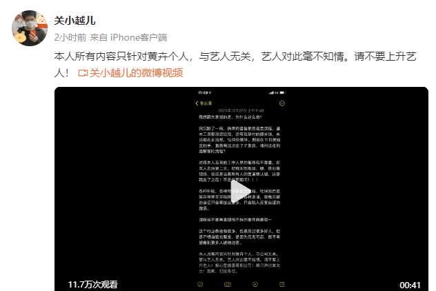 搜狐娱乐讯 12月27日,邓为前助理“关小越儿”在社交媒体放出一段与邓为经纪人黄卉的录音,并发文表示:“本人所有内容只针对黄卉个人,与艺人无关,艺人对此毫不知情。请不要上升艺人!”据悉,此前“关小越儿”在社交平台上爆料称自己被前公司负责人黄卉无故开除,并被拖欠薪资。