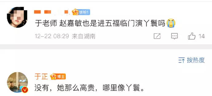 搜狐娱乐讯 近日有网友询问于正新剧选角,于正称赵晴将饰演丫鬟,并否认赵嘉敏在新剧饰演丫鬟,称她那么高贵哪里像丫鬟。