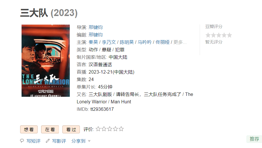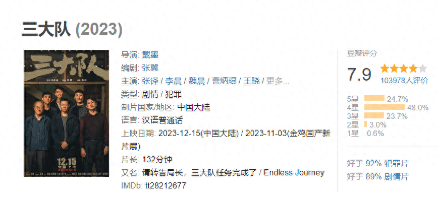 张译主演的电影《三大队》在上映之后就备受大家的关注,现在票房更是冲到了3.5亿,豆瓣开分也获得了7.9分。