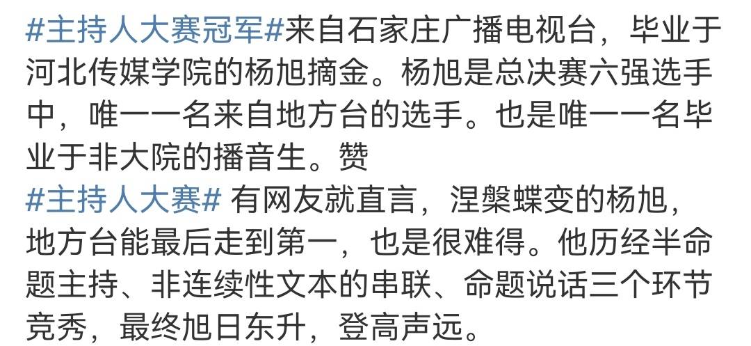原标题:主持人大赛:杨旭逆袭夺冠,得分比上届邹韵还高,网友为啥不认可