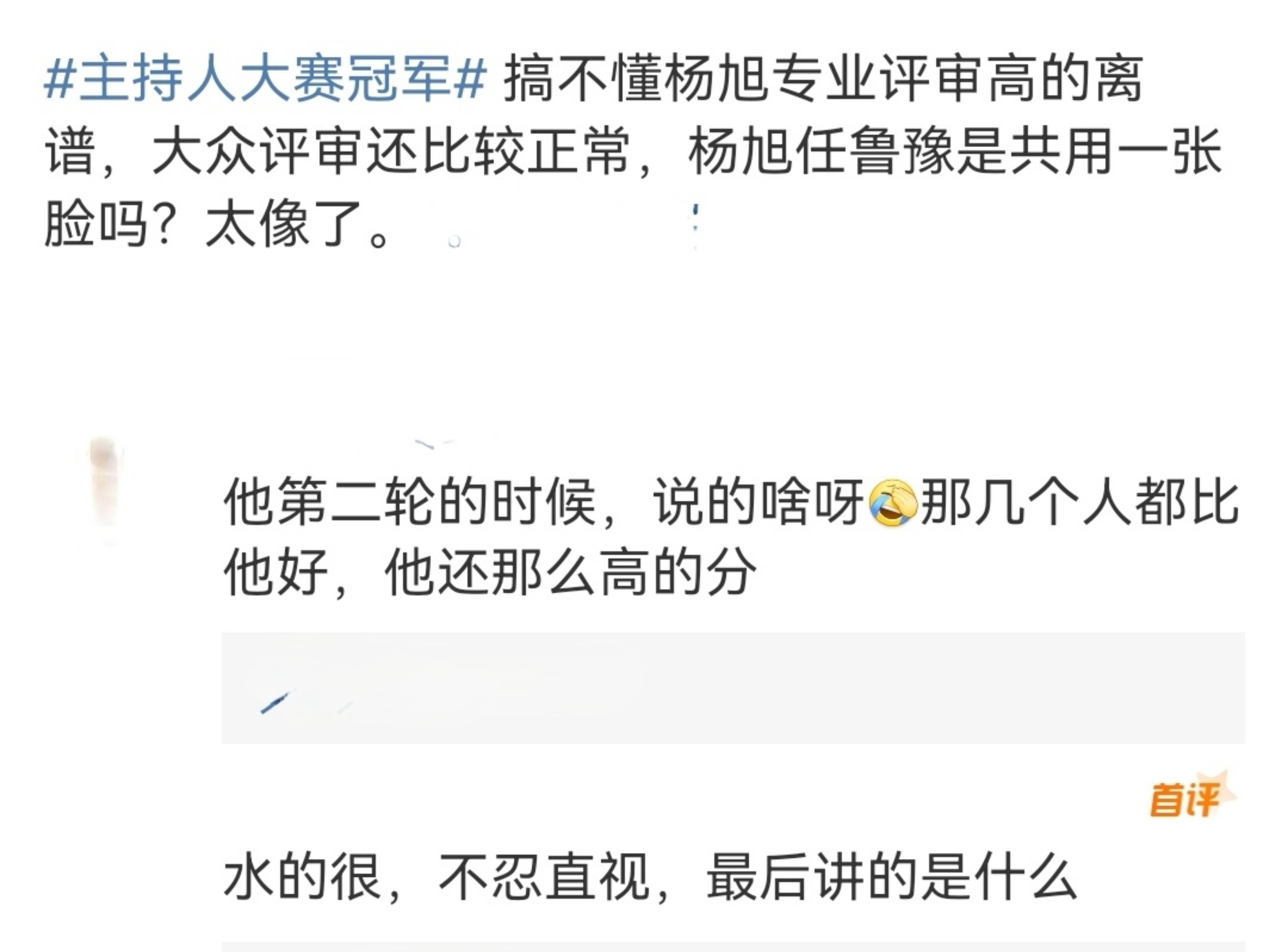 不过,网友们对于杨旭这位新晋央视主持人大赛金奖,似乎并没有邹韵、蔡紫之流认同度高。评论出现两极分化,吐槽的更比比皆是,“搞不懂杨旭专业评审分高得离谱,大众评审还比较正常”、“他第二轮说的啥呀,其他人都比他好,他还分最高?”、“水得很,简直不忍直视,最后讲的是什么?”