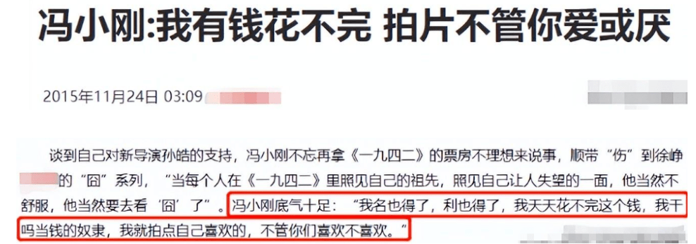 但后来“冯氏喜剧”的时代已经过去了,冯小刚则解释,自己已经不是把“观众需要”放在第一位,他想拍点自己喜欢的,而且,他的钱已经花不完了。