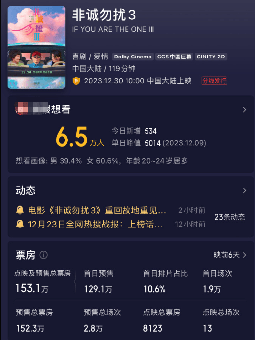 从资料上来看,12月30日上映的《非诚勿扰3》,预售票房只有150万左右。