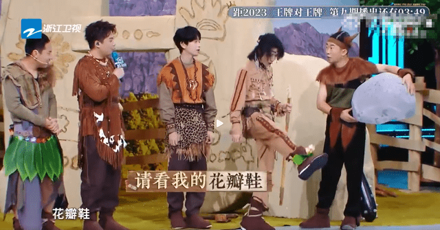 《王牌对王牌》挑选队员时,花花边唱《我的滑板鞋》边炫酷出场,在被杨迪质疑“原始人怎么会有滑板鞋呢”时,立马展示自己鞋上绑着的花朵,“滑板鞋”秒变“花瓣鞋”,可以说相当有理有据了。